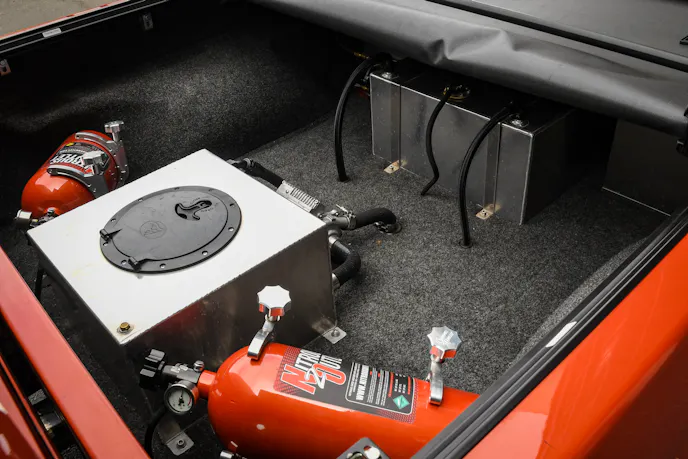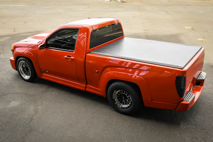 The bed of the Colorado is all business too. Two custom-painted bright orange Nitrous Outlet bottles were the first thing we noticed when the bed cover was opened up. We then saw the ice tank and fuel cell perched upon a Bedrug. And while the bed of this Chevy is nice, it’s what’s under the hood that really got our attention.