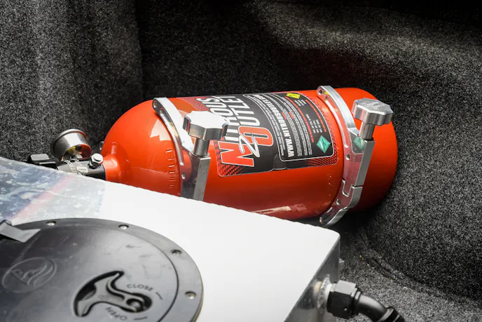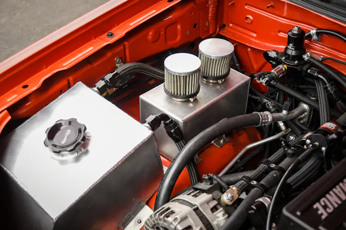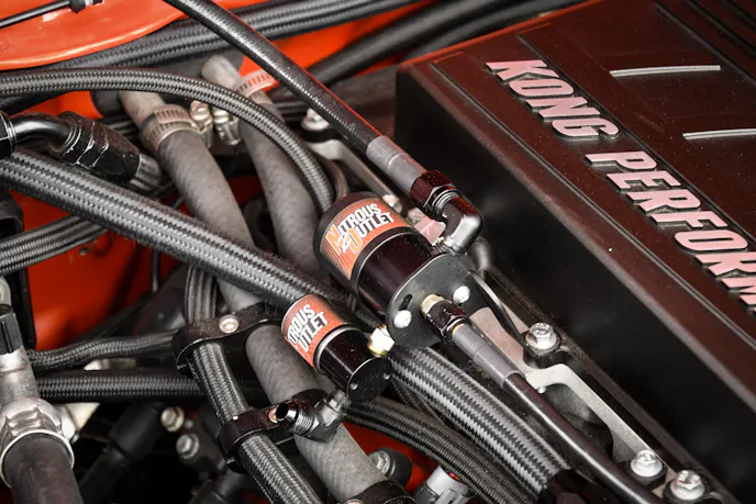 The bed of the Colorado is all business too. Two custom-painted bright orange Nitrous Outlet bottles were the first thing we noticed when the bed cover was opened up. We then saw the ice tank and fuel cell perched upon a Bedrug. And while the bed of this Chevy is nice, it’s what’s under the hood that really got our attention.