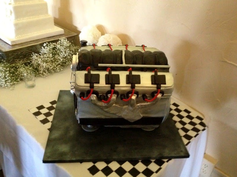A shared love for the LSX and racing is one of the things that brought Sarah and James together. Sarah tells us, “The reason behind the cake is my husband and I have a Fox Body Mustang with a 6.0L liter turbocharged LSX motor. It is an iron block LQ9 with a Borg Warner S400 T6 turbo. It runs 5.80’s on 275 drag radials. It’s still a real street car, and has A/C, heat, and a radio. We built the entire car together from a roller, and even built the turbo kit ourselves.”