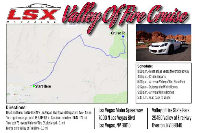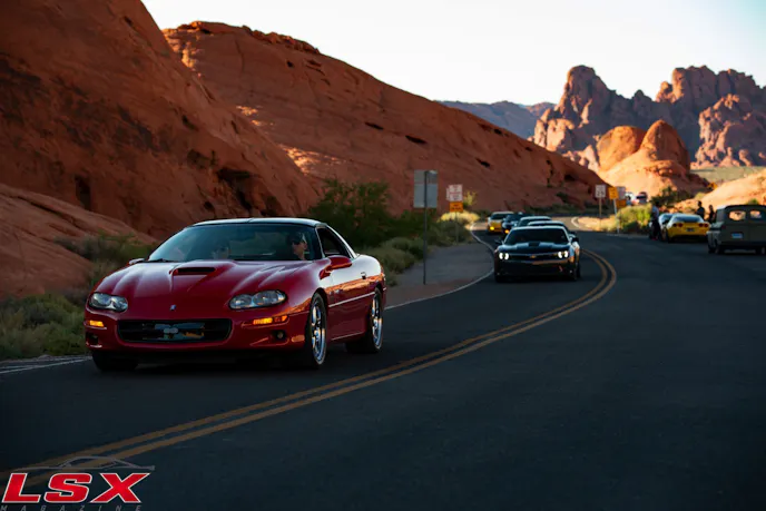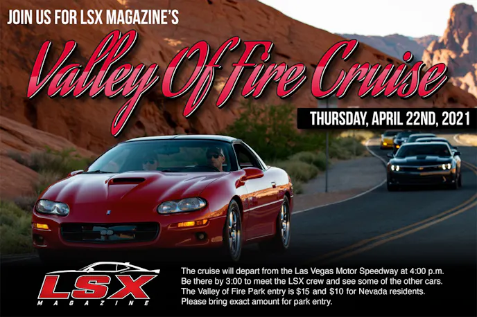 LS Fest West in Las Vegas, Nevada, is right around the corner. It’s a fantastic event for any car enthusiast as you can find just about every make and model vehicle on the grounds of Las Vegas Motor Speedway. There you will be able to see all types of attractions, including drag racing, off-road racing, autocross competition, and many more. However, if you arrive in Las Vegas the day before the show, April 22, we have another treat for you. LSX Magazine will be hosting our second annual Valley of Fire cruise.