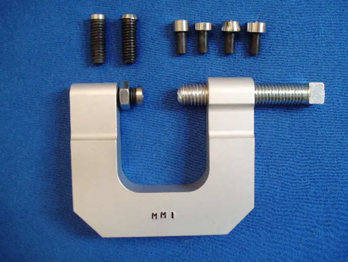 The tool is CNC machined from 6061-T6 billet aluminum and uses high-grade 4140 hardened steel components for greater durability and longer tool life. Its overall size is 4” x 3.5” with a 2” wide by 2.5” deep throat opening. It is supplied with three depth adjustable bases, one each for truss-head and flat-head rivets, and one for setting small rivets; and four interchangeable drive bolt tips, one each for setting large and small rivets and one each for truss head and flat head rivets.