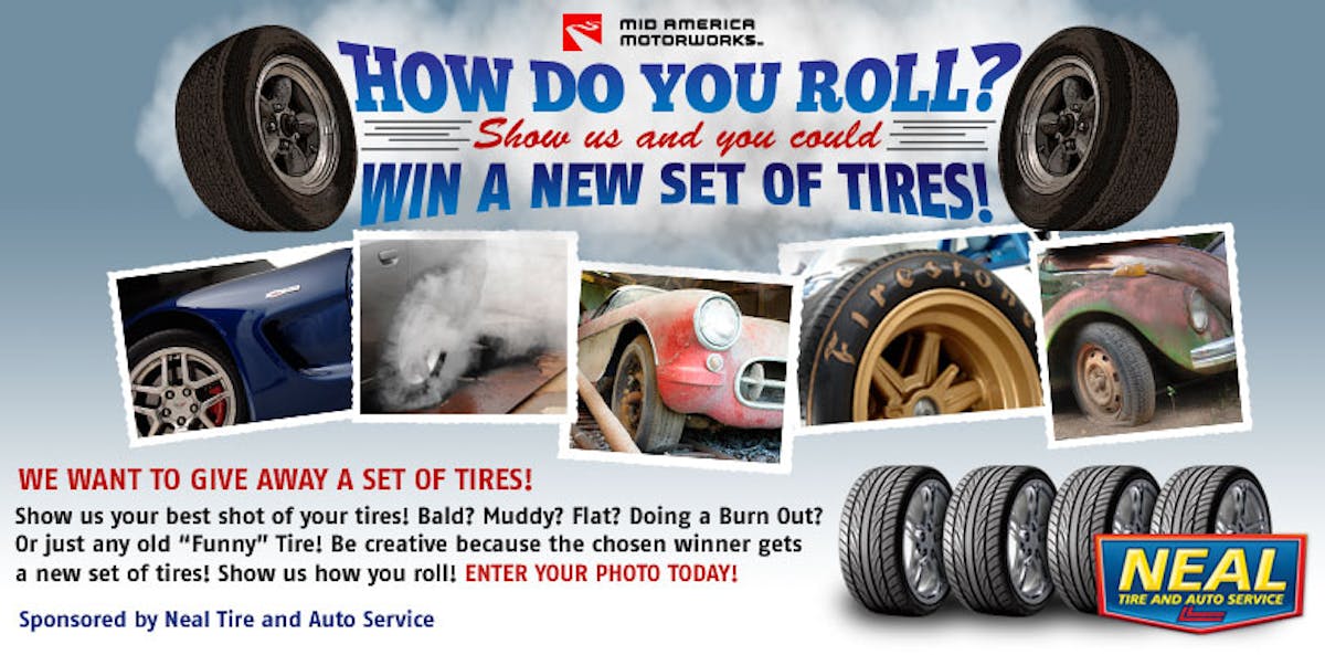 How do you Roll? Show us and you could WIN a brand new set of tires! Send us your best shot featuring your tires! Bald? Muddy? Flat? Doing a Burn Out? Or just any old “Funny” Tire! Be creative because the chosen winner gets a new set of tires! Enter the Mid America Motorworks photo contest sponsored by Neal Tire now! You have from October 1st to October 22nd to submit your creative photo! We will pick the most creative photos, then you and all our fans will vote for their favorite entry. Winner receives 4 brand new tires compliments of Neal Tire!