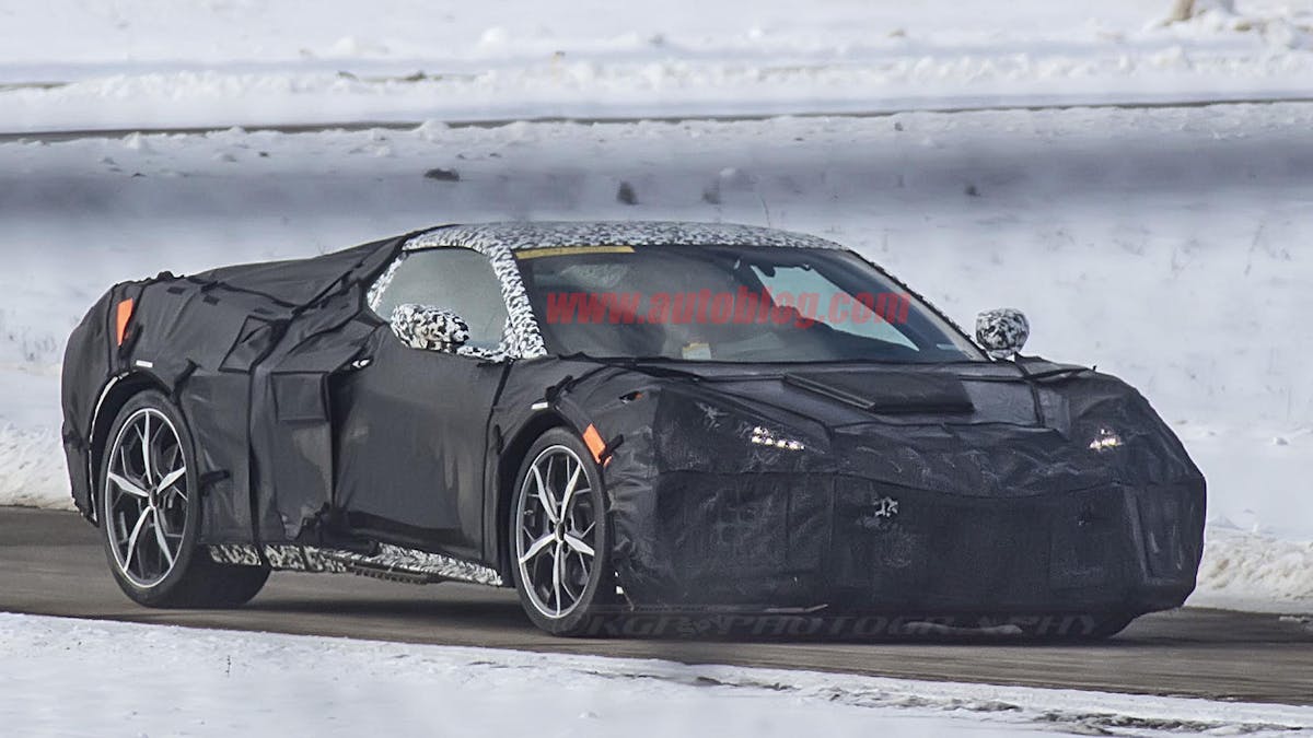 While the deck lid is still covered in camouflage, we get a good idea of what shape it will ultimately take. We can also see a very narrow rear window and a backup camera molded into the bodywork just above it. The rear of the car is very supercar-esque, with the “flying buttress” style of rear quarters surrounding the rear deck lid. However, what we don’t know is if the Gen VI mill that will likely power GM’s supercar will be visible through the decklid–though we have a sneaking suspicion that it will.