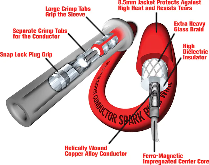 Available in red or black, the wires also have snap-lock plug grips, separate crimp tabs for the conductor and sleeve, 8.5-mm jackets that protect against high heat and resist tears, extra heavy-duty glass braids, high-dielectric insulators, ferro-magnetic impregnated center cores and helically-wound copper-alloy conductors.