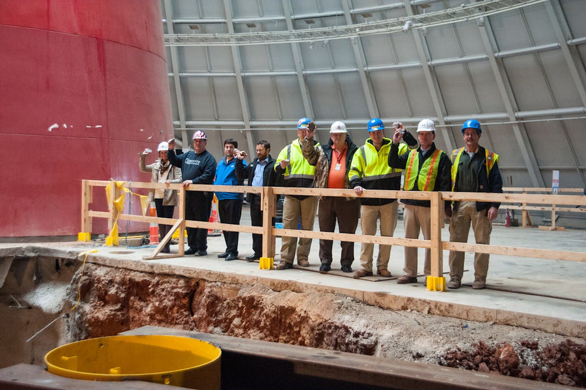 The rock was inscribed with Awesome God, Everyone Safe by Executive Director Wendell Strode who said, “The good Lord let it happen. It was roughly a quarter to six in the morning and we did not have anyone in the museum. No staff, no visitors, no guests. We’re so thankful for that.” She then lobbed the rock into the hole after nearly seven straight weeks of construction.