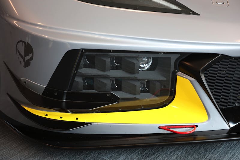 The car shares more than 80-percent with the road car, and the chassis are all built at Corvette Assembly in Bowling Green. Speaking to Gary Pratt during the presentation confirmed — apart from changes to the front crossmember and inner wheel arches — most of the rest of the car uses the stock road-car chassis. The wider wheels and tires needed for racing — and the re-use of the front trunk space to locate the radiator — helped free up space for the spotlights under the headlights, which are both made by the same company that builds the road car lights.