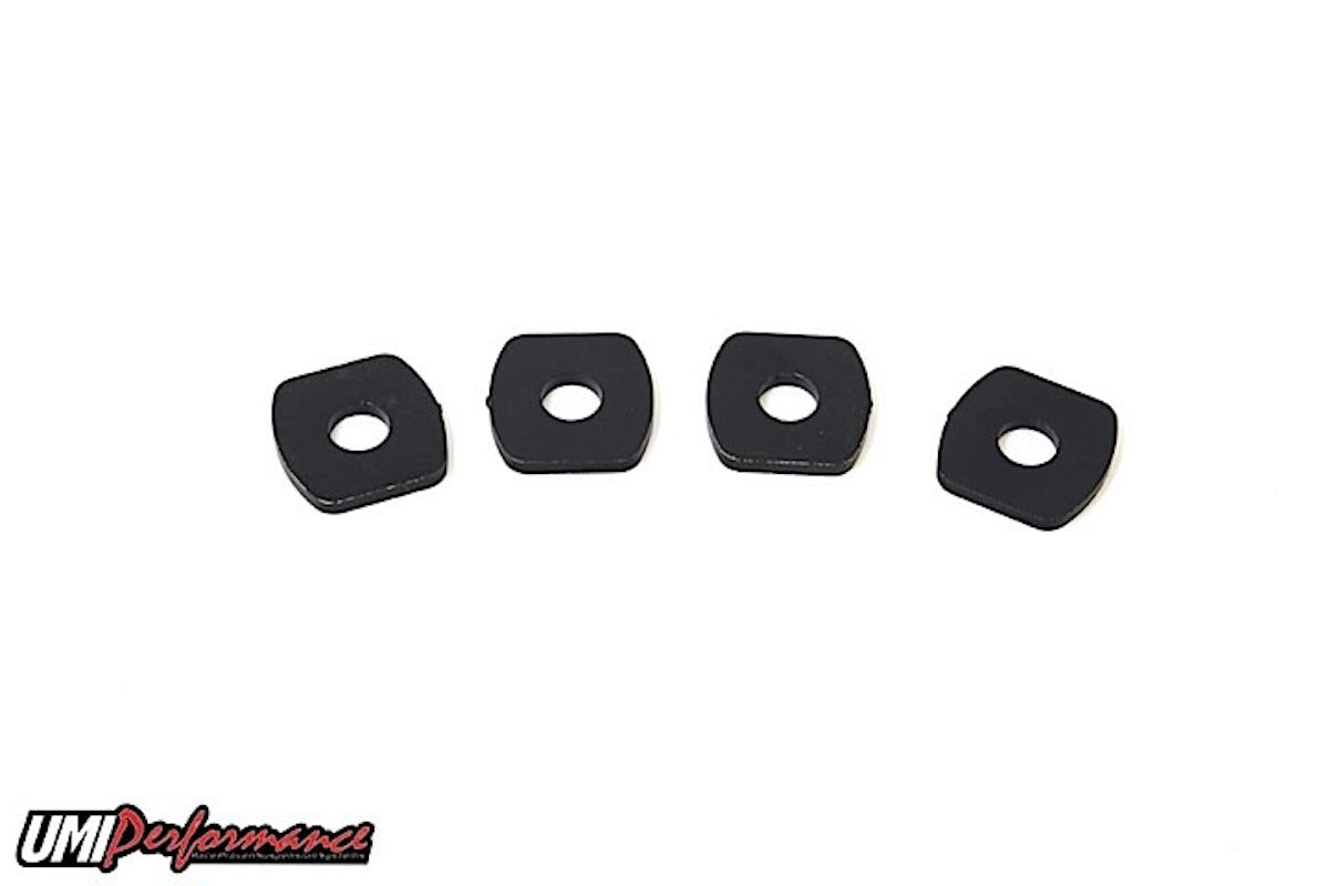 UMI’s 2518 anti-eccentric washers are designed to prevent unwanted alignment changes in your 5th Gen or G8 rear suspension. The 3/16” thick laser cut washers fit in the exact factory location and provide a stable location for UMI (or other aftermarket) adjustable toe rods or adjustable rear lower control arms. Racing stress or hot street cornering can move the offset factory washers causing rear alignment issues. UMI’s 2518’s are a great way to increase rear suspension reliability. Kit includes 4 laser cut black zinc coated washers, anti-eccentric washers should only be used on adjustable components. P/N 2518 fits rear toe rods or rear lower control arms. Four washers will work on a pair of toe rods or control arms.