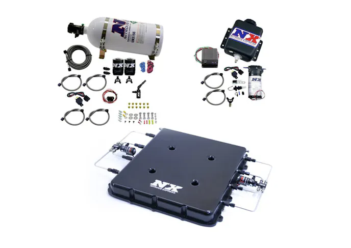 The last option (PN: 20939BMF-10) — and our favorite — includes both water-methanol system and the nitrous oxide system with the lid for both power and control. You will receive the billet lid, carbon-fiber Lightning solenoids, an industry exclusive billet aluminum Lightning 500 bottle valve, stainless steel braided lines, stainless steel bottle brackets, wiring, switches, and jetting for 100 to 300 horsepower. This system also includes all of the necessary water-methanol parts such as carbon-fiber lightning water-methanol solenoids, high-pressure electric pump, stainless braided soft lines, pre-bent stainless steel hard lines, filtered nozzles, plated fittings, composite reservoir, switches, and the NX stage 2 digital progressive methanol controller.