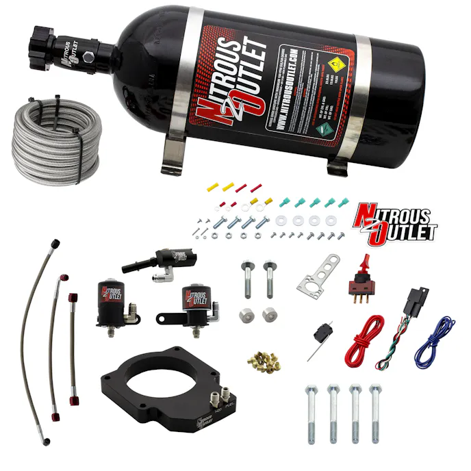 This system includes the custom designed solenoids, vehicle-specific solenoid brackets, pre-bent hardlines, gaskets, hoses, electrical pack, application specific hardware, Wide Open Throttle (WOT) switch, nitrous feed line, and jetting for 50-100-150-200 horsepower. If you are looking for more than the standard 200 horsepower settings, the plate system will flow up to 400 horsepower with added jets. These systems are E85-compatible with additional jetting available through Nitrous Outlet.