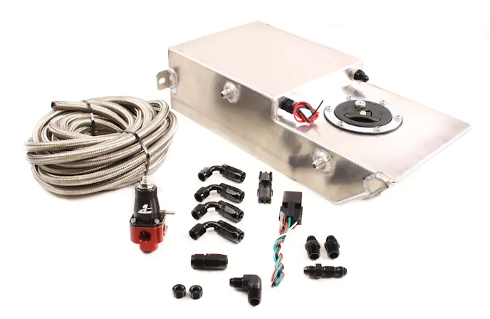 Nitrous Outlet’s dedicated fuel systems come complete with a custom built hand welded 2-gallon fuel cell, mounting brackets, Deatchwerks in-tank fuel pump, Aeromotive fuel regulator, Aeroquip -6 AN hose, fuel lines, and fittings. It will allow you to run race fuel in the nitrous system while guaranteeing you have enough fuel to support your nitrous system.