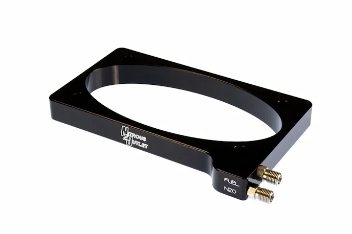 The conversion nitrous plate is machined from billet aluminum and comes with a black anodized finish and CNC engraving. All of the Whipple big-bore nitrous plates are flow tested to ensure proper function and flow characteristics. It has six specially designed fuel and nitrous discharge ports that mix the nitrous and fuel in the air intake charge for the best-atomized mixture possible. These ports allow for higher horsepower levels with precise distribution into the air stream, allowing for even cylinder to cylinder distribution.