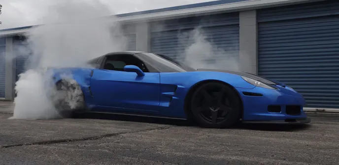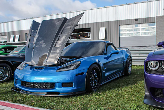 The Canton, Michigan native upgraded his C6 during the long winter months, with various external body parts receiving ZR1 and Z06 conversions. The car was then resprayed black well ahead of being wrapped in a 3M “Blue Flame” vinyl, at which time Hartman upgraded his C6’s hood, roof, side skirts, rear diffuser, and more with carbon fiber components. Then came those ZR1 carbon ceramic brakes and Weld S77 wheels you see pictured here, but not before disaster could strike.
