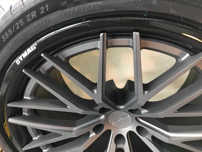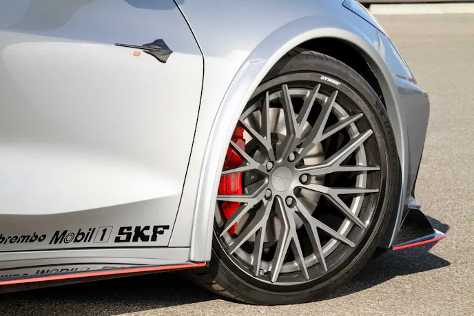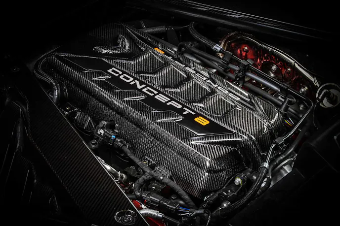 A carbon splitter runs across the car’s bow, accentuated by a searing red stripe. Other carbon bits adorn the car’s roofline, camera bezel, side openings, and rear fascia area. Airflow is also constructively adjusted with the carbon-based rear wing featuring end plates for accentuation. As you peer into the engine bay, a Concept 8 engine cover also wears that woven look. Other modifications which don’t rely on the carbon fiber wow factor are the fender flares which allow for massive Michelin PS4S 355/25-series R21 tires out back, 285/25-sized 20-inchers up front. But those Forgeline wheels do have a splash of carbon to keep the strong yet lightweight theme.
