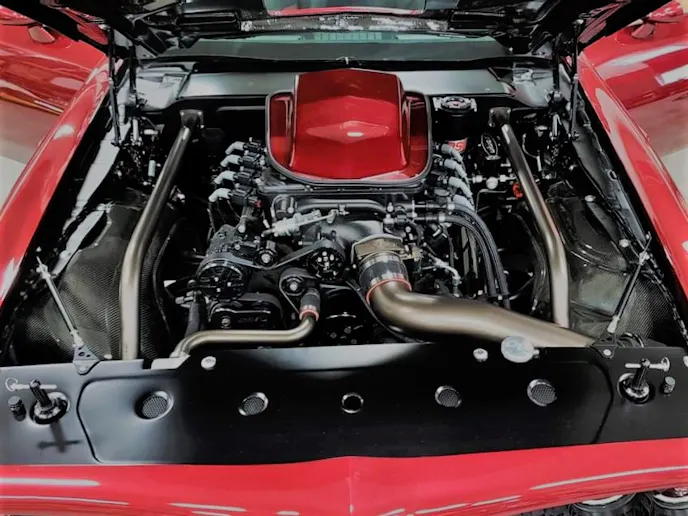 Handling upgrades are delivered via a full RideTech Track 1 suspension setup that’s been built around its own unique rear cradle, as well as its Instinct Electronic Adaptive Shocks and Tiger Cage. There are also Wilwood brakes at every corner, Detroit Speed Inc. frame connectors underneath, and Michelin Pilot Super Sport rubber wrapped around all four Forgeline Spline Drive 19-inch RB3C wheels.