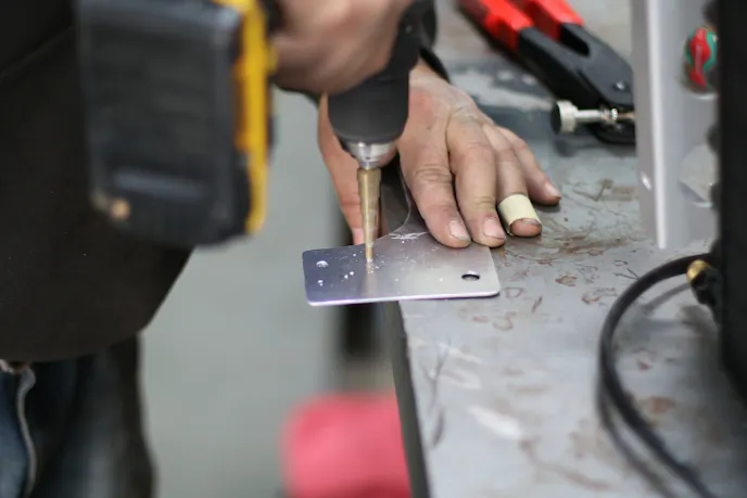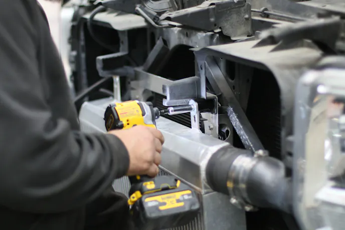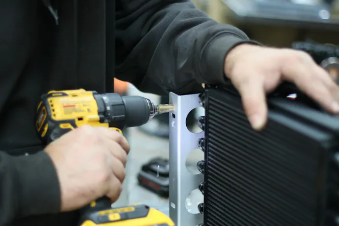 To ensure efficient transmission cooling, we opted to install a trans cooler from Derale Performance. However, this wasn’t just a plug-and-play experience. First, we had to remove our Sierra’s front grill, exposing our ProCharger’s intercooler. Being quite large, the fan needed a new place to mount. Using a piece of sheet aluminum, we cut and drilled it to the perfect size to accommodate the cooler’s bracket for that perfect fit. Once behind the intercooler, we used nut-serts on the cooler bracket to fasten things up!