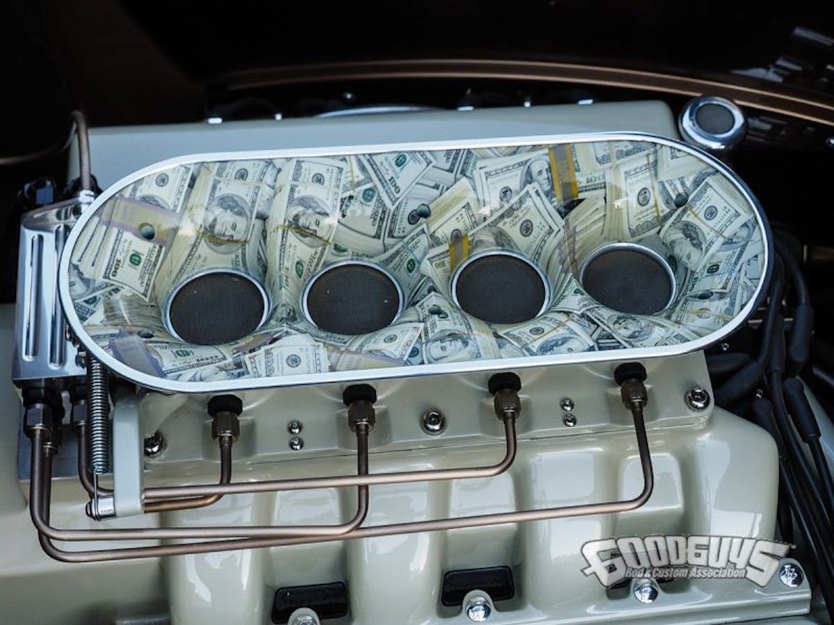 Hailing from Rio Linda, California, Wathor’s Ford Coupe was an exercise in refinement, attention to detail and painstaking perfection. Built by Kenny’s Rod Shop in Boise, Idaho, it sports a fuel injected 351 Ford V8 (natch) and Arias Ford Hemi heads and wild intake imprinted with $100 dollar bills. In return, this beast belts out 750hp and gives meaning to the term “Iron fist in velvet glove…”