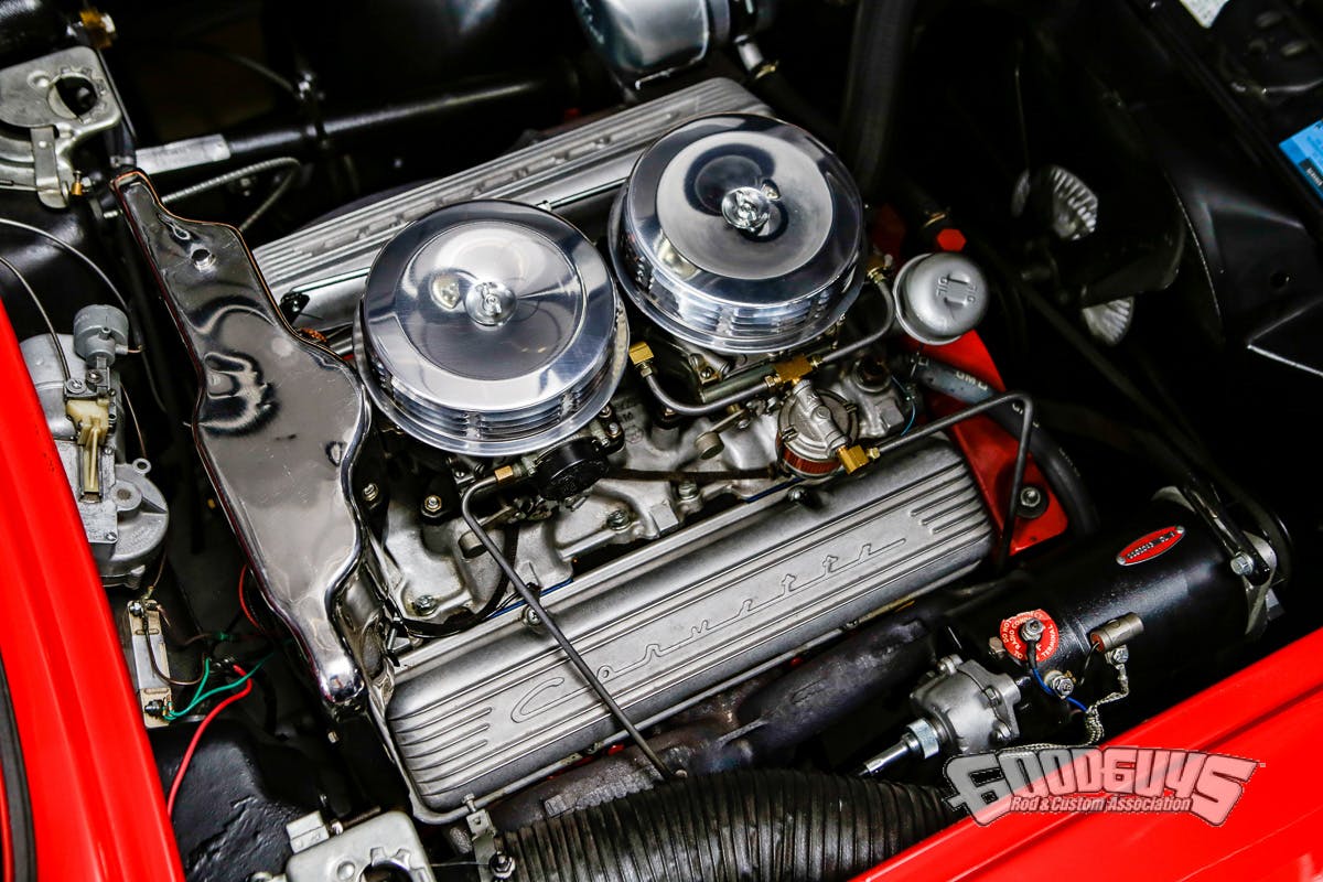 This little red ‘Vette is running a 270 horsepower 283 c.i. small block with dual four-barrel carbs, solid lifters, and a high-lift cam hooked up to a 3-speed transmission. The interior is an exercise in red, mid-century modern bling that only Harley Earl could’ve pull off.