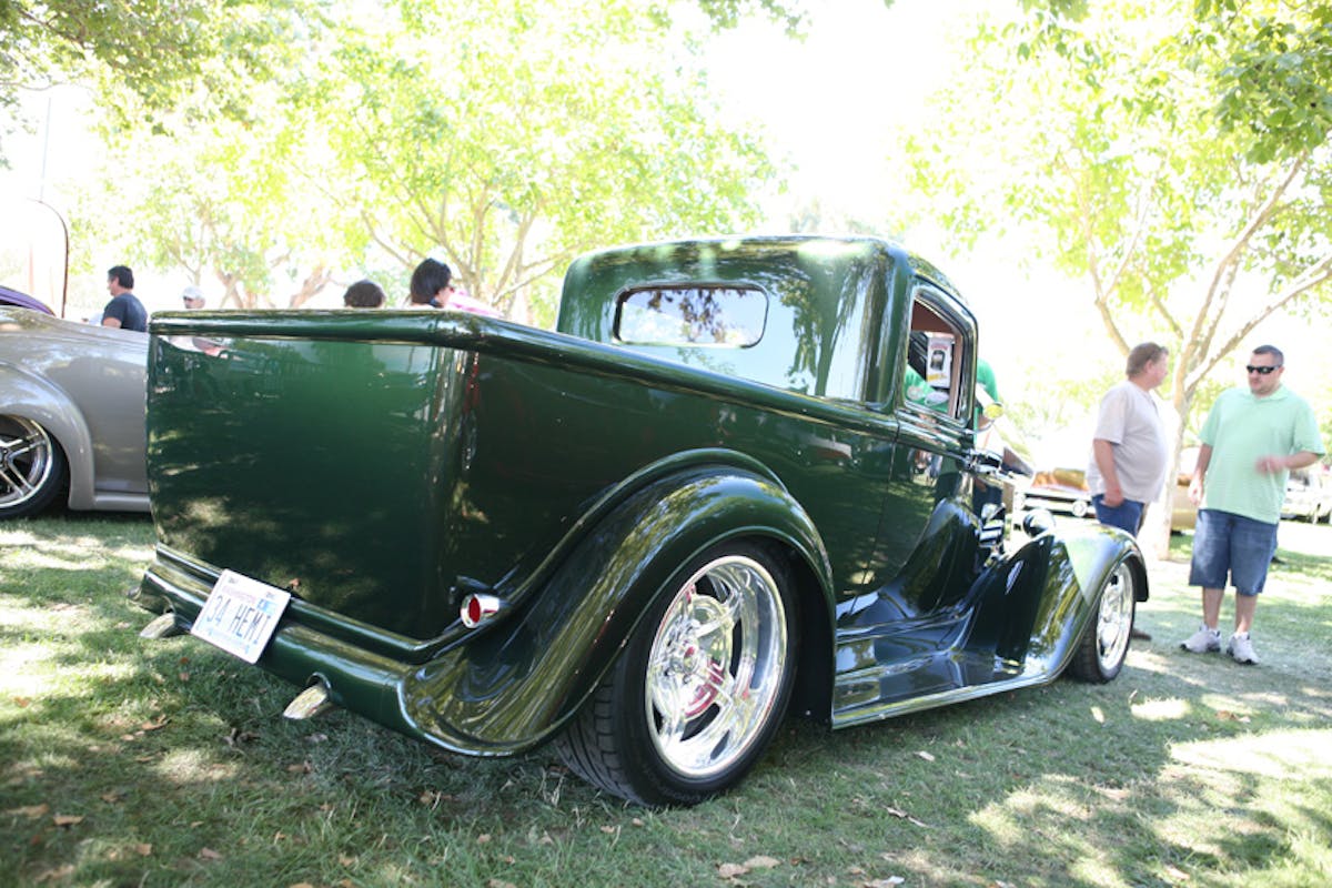 The smoothy body rides on top of a Chromoly tube chassis fitted with modified Heidt’s IFS and IRS and sprung with Ridetech air shocks. When the bellows are bled out, it’s a low slung beauty to behold. The solid wheels offer a retro look but are anything but. Measuring 8×18-inches and 10×20-inches, they were machined from solid aluminum with custom made “Deluxe 37” hubcaps.