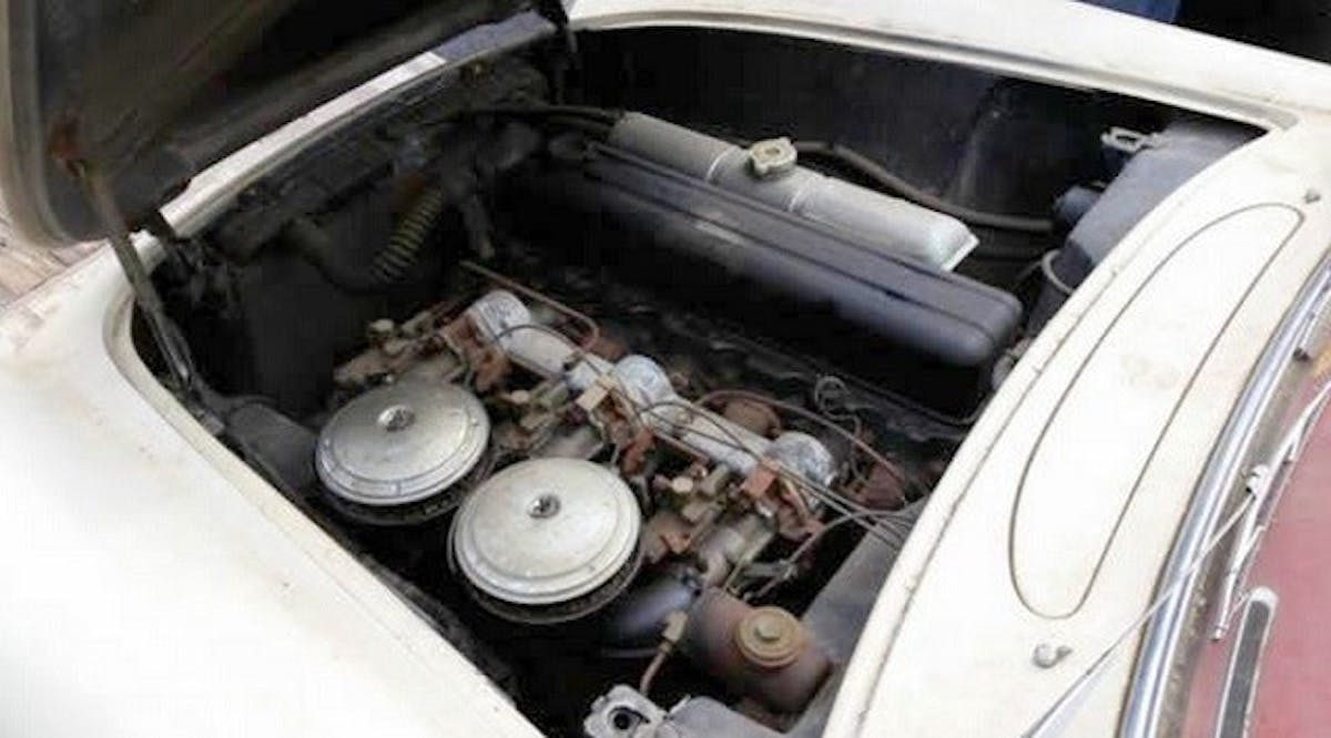 Looking closer we see that the car has one of the popular performance upgrades of its day which features a multi-carb intake manifold with two Rochester carburetors, topped off with chrome louvered air cleaners. The auction descriptions lists the Corvette as also having a “Scotts” aftermarket fiberglass hardtop. After looking at the cloth top and the clip-on side windows, we know why the former owner would want something more sturdy.