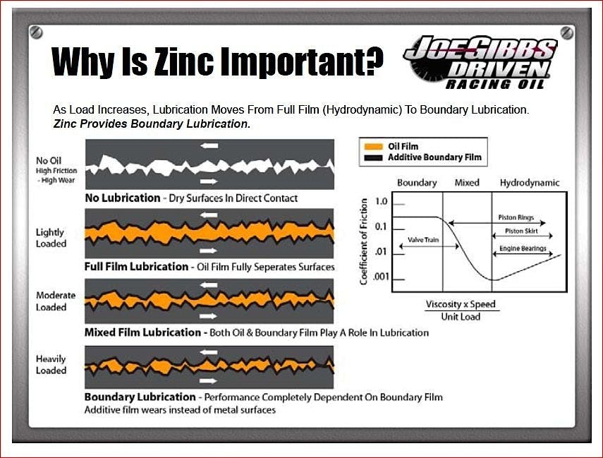 Zinc and Phosphorus, or ZDDP, are the two main components that comprise the anti-wear package that exists in engine oil and what creates the boundary layer, or oil film, between mechanical components. Unfortunately these are the two additives that the API reduces, to extend catalytic converter life and efficiency. Since 2010, newest engine oil classification by the API is SN; zinc and phosphorus are limited to 800 ppm and 600 ppm, respectively. With the advancement of mechanical component technology (i.e. not using journal bearing turbos and flat tappet valve train), the necessity of these aggressive additive packages to compensate for mechanical deficiencies has been falling for vehicle manufacturers.