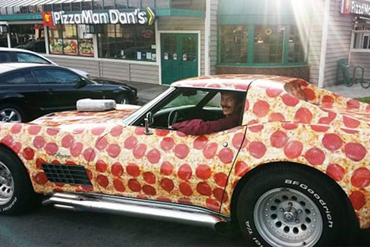 Joining his love for cars, community, and exceptional taste, Dan Collier AKA PizzaMan Dan enlists his daily driver to serve as a rolling mascot for his family owned business. Currently managing operations of his five pizzerias located in Ventura County, California, Owner/Operator-PizzaMan Dan spends a good amount of a normal work day traveling between locations via his screaming pepperoni wrapped 1972 C3 Corvette.