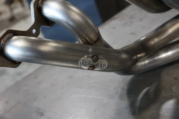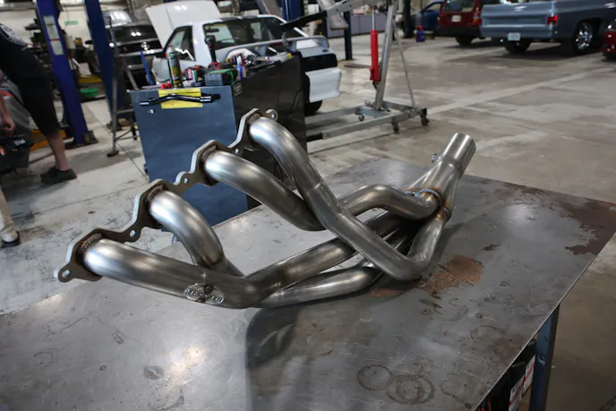 ?si=m7ssQmdTXeqE-ekuThe main focus of day two was the front end of the car, specifically headers, accessory drive, and front suspension. Rick began installing the Hooker Blackheart 1-7/8-inch stainless steel headers and immediately saw that the new Flaming River power steering rack we installed was occupying some of the same space that the driver-side header needed. Modifying the header would be necessary to allow room for the steering shaft to attach to the power steering rack. Because the headers are made from quality stainless steel, cutting and re-welding them in order to reroute the primary tubes was no problem. Thanks to Rick’s expertise, the driver-side header was modified to re-route the number 1 and number 3 primary tubes in short order. Once the welds were cooled, Rick installed the header, and we now have plenty of clearance for the steering shaft.