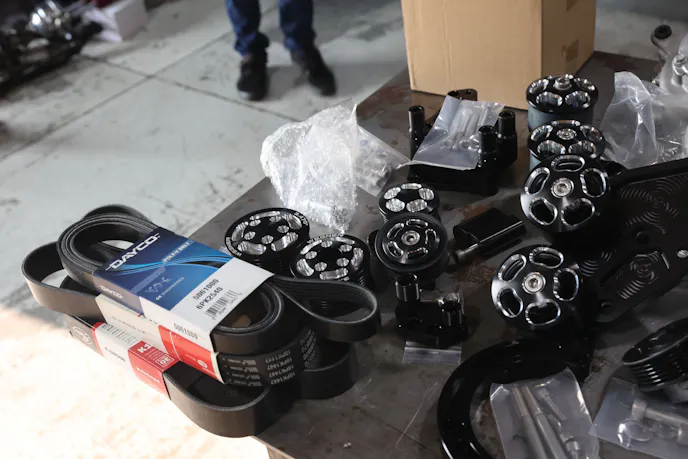 With the power steering rack, front suspension, and headers all installed we could then lower the car and work on getting parts installed in the engine bay. Bolting an engine into a car is the easy part. Once it’s bolted to the frame rails, installing and attaching everything else that’s needed for an engine to run consumes a lot of time. To run all of our accessories and spin the Whipple supercharger we installed a beautiful accessory drive setup from Wegner Automotive.