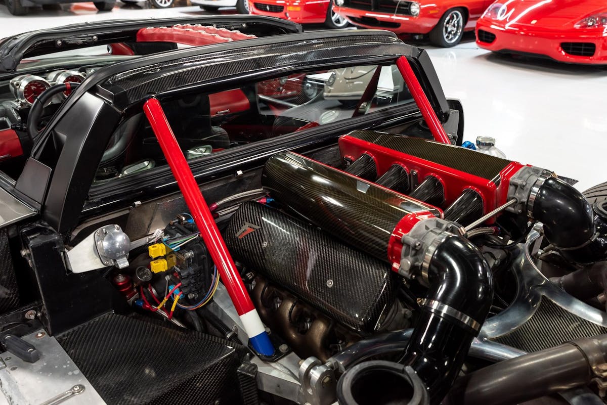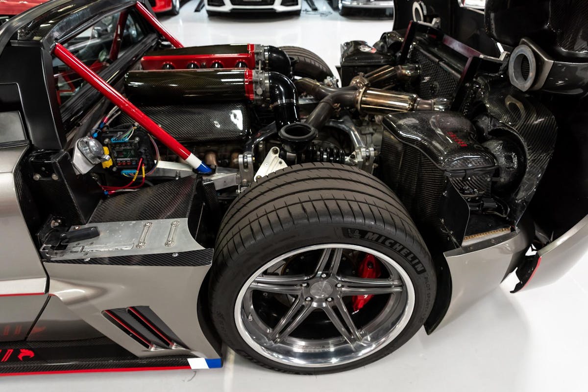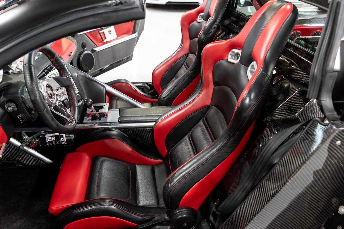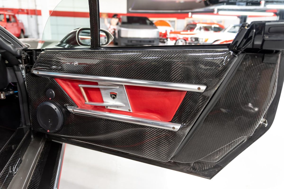 The F7 also rides on 20-inch Forgeline wheels and includes a removable roof panel for open-air driving. Modifications listed by the seller include an upgraded radiator and fans sourced from a C6 Corvette ZR1, some custom vinyl graphics, and a modern aftermarket audio system featuring Bluetooth connectivity.