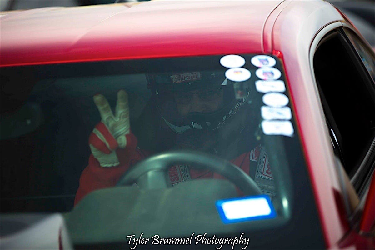 We’ll let Robert take over from here. Robert says, “There is a pass through lane for speed tickets, and those cars that use chutes or need assistance go outside the coned area to keep traffic moving. So, the AirTech of Houston Mustang is sitting near the ticket window and I pull up next to and just behind him. The driver is obviously excited and jumping around. He tells me to open the passenger door. I still have my helmet, gloves, harness, HANS device, radios, etc hooked up in addition to the window nets and door bar, so I’m kind of a captive at the moment. The ticket dude comes over and hands me my speed ticket; and I start giggling, but I manage to open the passenger window and unlock the door.”