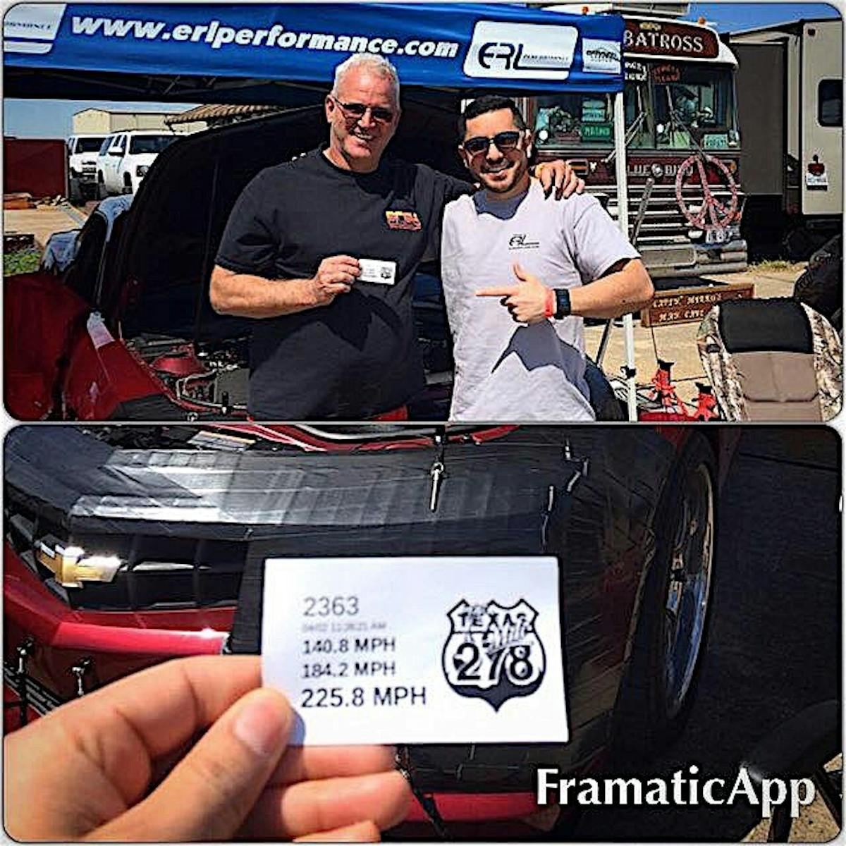 I finally got to tell him I now had the record for the fastest 5th-gen Camaro ever in a ‘Standing Mile’ at 225.8 MPH, and he yells nuther hug. Then, he looks up and says the digital clock only showed 225.4, which led to the gang with me thinking I had just missed the record. But the printed card is the official record (back to back world record runs. I was stoked and couldn’t stop giggling). He asked me why I was giggling and I mentioned that I had beaten the record by 0.1 mph.