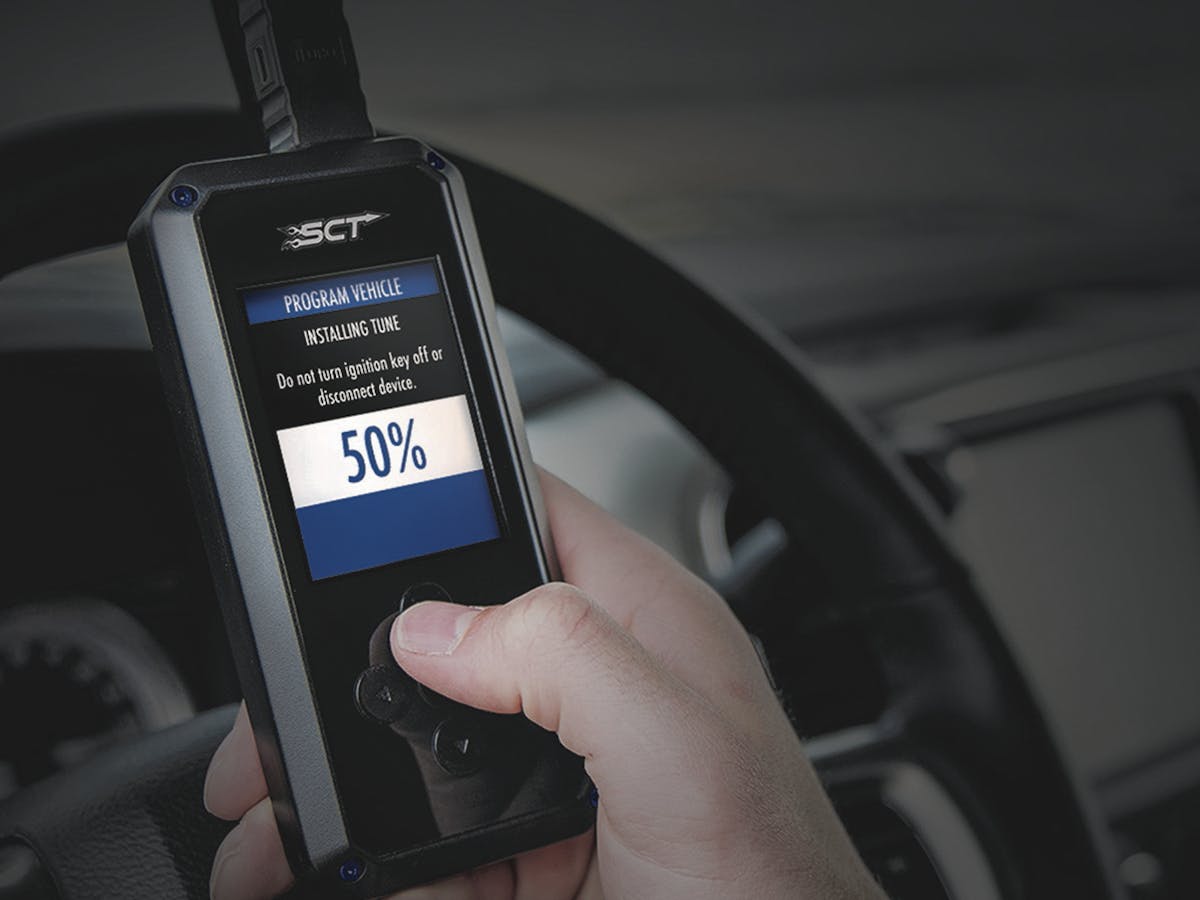 Yes! The tuning device can store up to 20 custom tune files (created by any SCT Custom Tuning Dealer) for reflashing the ECU. It has user-adjustable vehicle options to allow for cold-air intakes and rear gear ratio and tire size changes. It also stores the original factory calibration, to allow for easy restoration back to the factory calibration.