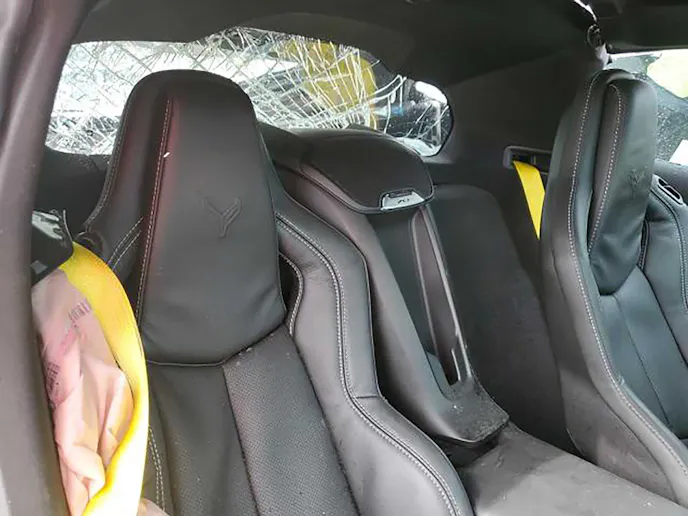 The exterior of the C8 retains most of its Hypersonic Gray Metallic paint, and that high wing spoiler looks to be intact. Inside, the Black GT1 bucket seats have a few airbags protruding out from behind those perforated covers. The car is a 1LT trim, and by the looks of the interior seams, all of the soft goods have shifted to the right considerably. Even with all of the air-baggery today’s cars have available, we wouldn’t want to have been inside this car when it all went sideways – apparently quite literally.