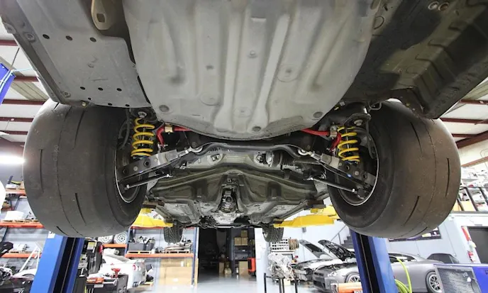 The suspension Owen ended up going with in the rear was a pair of AFCO coilovers, which he inverted for a little less unsprung weight, and a pair of JIC Magic coilovers up front for the ride he desired. With intentions of putting down close to 1,000 horsepower, Owen needed to upgrade the factory rear end to handle all of the power, even though the stock differential can can handle up to 800 horsepower. He ended up going with The Driveshaft Shop‘s custom 9-inch rear end and a beefy carbon fiber driveshaft, also from Driveshaft shop.