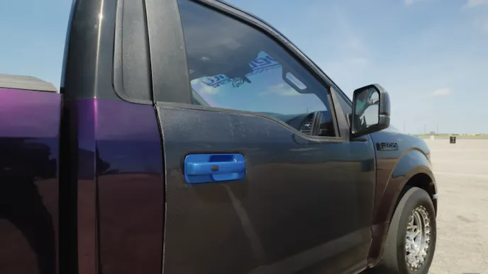 This F-150 features a 5.0-liter Coyote engine that has been resleeved and has had o-rings installed between the cylinder heads and block. According to Guerra, the engine has twin Precision Turbo Next Gen 74/75 turbochargers feeding air through an intercooler system he fabricated and into a Plasmaman billet aluminum intake manifold. Power is sent through a GM TH400 automatic transmission to a narrowed factory Ford rearend.