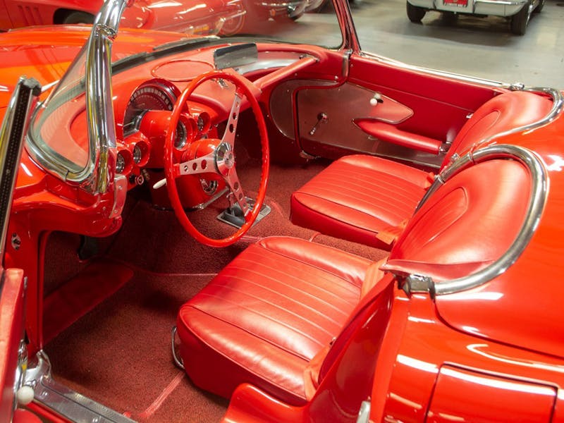In the other corner, we have this beautifully-restored, dual-four equipped ’60 Corvette. Same exterior color, same interior, but totally different. White walls and hubcaps are the first clue that this Corvette has a different focus in life.