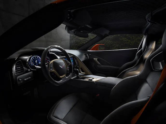 The new design package complements the Corvette ZR1’s tradition of offering maximum performance with refinement and design distinction. The driver-focused, well-appointed cockpit includes standard leather-trimmed seats, with sueded microfiber inserts offered. Heated and vented Napa leather-trimmed seating is also available, as well as a carbon fiber-rimmed steering wheel, competition sport seats, Performance Data Recorder, Bose premium audio system and more.