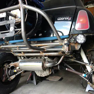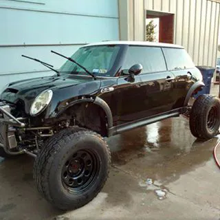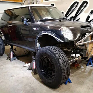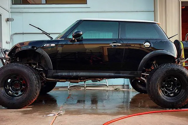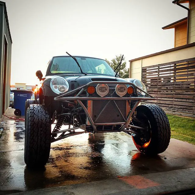 After some slight trimming for tire clearance, Scott was able to throw on some black powder coated steelies, wrapped in whopping 33-inch Falken Wildpeak A/T tires. He added some Hella driving lights up front, LED fog lights in the rear– and now, this thing is just about ready to hit the dunes. We can’t wait to see pictures of this bad ass Mini soaring through the air. No matter how you look at it, this makes us hate Minis substantially less.