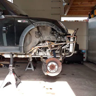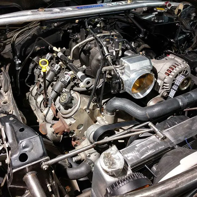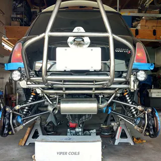 After countless nights in the garage, as you can see, the Mini has come a very long way. It’s not far from being completely finished now and Scott claims he’s having a blast creating this somewhat of a “dream car” of his. Yeah, you guessed it– this little thing is housing a V8, a 2004 5.3 Flex Fuel L59 to be exact. This car is the perfect example when referring to the saying “its what’s inside that counts.” Tubular steel subframes in the front and rear make is possible to run the 5.3/T56 drivetrain on the Mini’s body. The rear subframe adapts a 9.75-inch independent rear differential from a 2008 Ford Expedition, along with Expedition CV axles and wheel assemblies. “Pretty big for the little Mini,” Scott added. The suspension is fully custom, all fabricated by the owner himself.