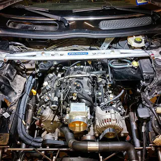 He bought his current car, a 2004 Mini Cooper S, back in 2010. He claims he had always thought about buying one and just happened to come across this great deal. In March 2015, Scott started to attack this new project full-swing– completely pulling out the motor and beginning disassembly in his very own garage. At the time, it held a smaller pulley on the supercharger, antiroll bars, and better struts– but, lets just say, that’s all gone now.