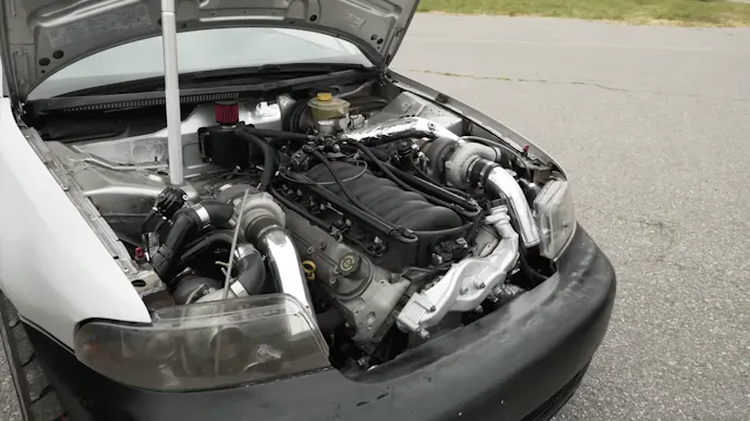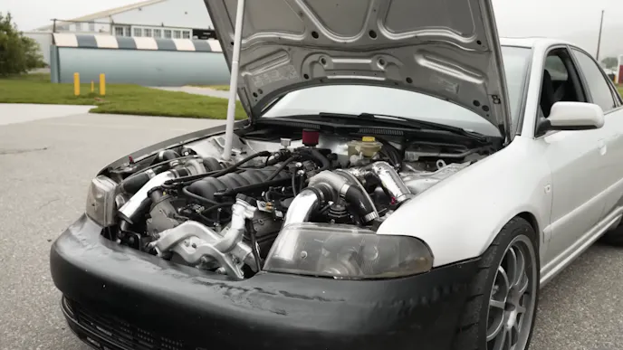 In THIS corner is the 2001 Audi S4. The S4 is an all-wheel drive sedan and this particular car is packed with surprises. To start, under the hood is an LQ4 6.0L LS with forged internals. Shockingly, that’s not the craziest thing in the engine bay of this Audi. There are also four — yes, four – GT35 61mm turbochargers pumping approximately 24 pounds of boost into the engine. According to the owner and builder of the car, Marnell, his best guess is that the car makes about 900 horsepower.