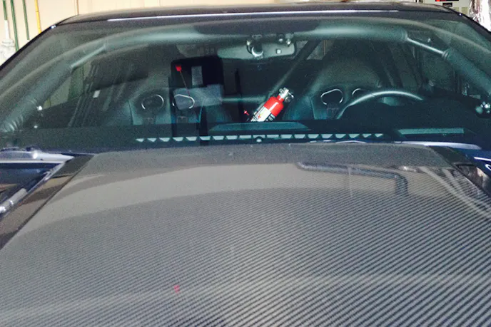 Most of the sanctioning bodies require a number of safety mods before you can enter a car in their competitions. To comply with these requirements, he installed such things as a roll cage certified for use in NHRA/SCCA sanctioned events and wrapped it in leather. Bolted to the cage are five point safety harnesses. For when it’s required, the cage also has provisions to connect window nets. He’s also got a set of Corbeau leather racing seats. Topping all this off is a full fire suppression system.