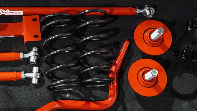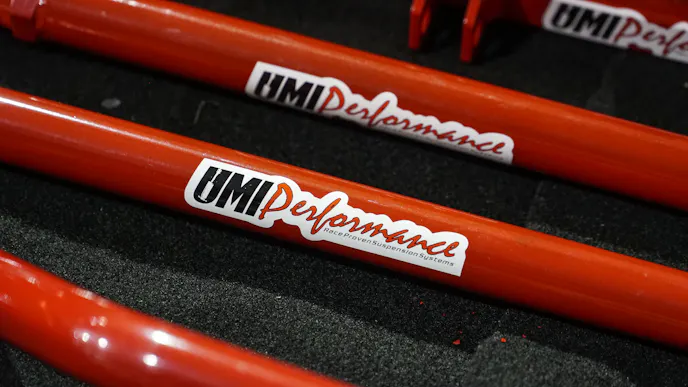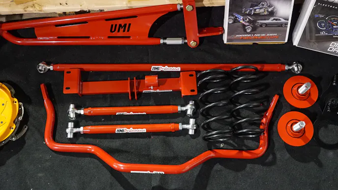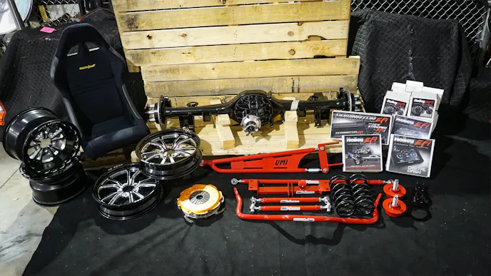 A complete rear suspension setup from UMI Suspension – spec’d to match the awesome front setup already installed – promises to keep us headed in a straight line. This traditional-but-trick setup will also give us some great technical content, as this particular UMI approach uses the company’s Rear Weight Jack System, which will allow us to set ride height while running ‘traditional’ non-coilover rear spring/shock combo, freeing up room in a particularly cluttered area of the vehicle, and helping us to reduce cost and complexity. No shocks just yet – UMI recommends setting ride height first and then measuring the shock height to make sure we get the perfect pair of rear shocks to match our setup. More on that soon…