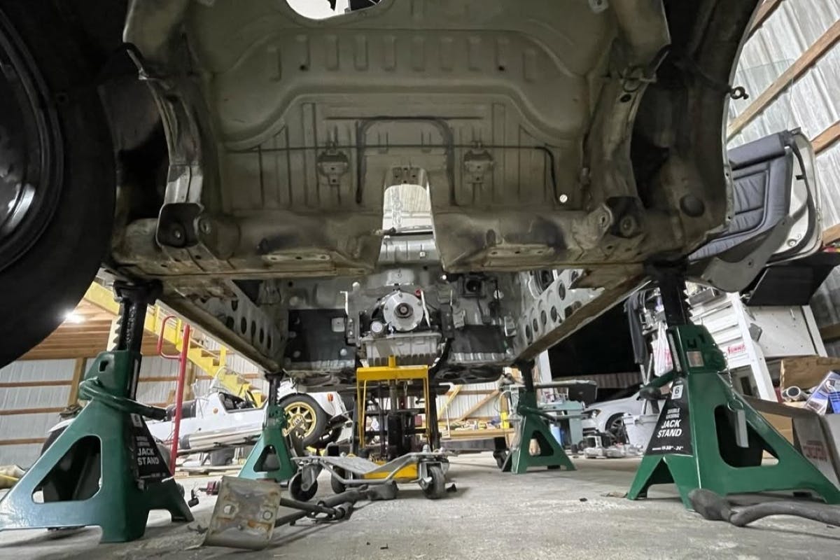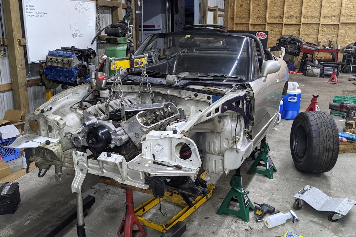 The compact, lightweight chassis was designed to offer the public a budget-friendly sports car, not the torque of a twin-turbo LS like a double shot of espresso. The choice was made to cut the floor pan and frame rails from the firewall to the rear bumper to make way for a tubular roll cage and bracing for the parallel four-link rear suspension to hold the axle. The brakes were upgraded with Nissan 300ZX calipers, and the rear tires are Nitto NT555R drag radials wrapped around five-spoke weld wheels to hold the power.
