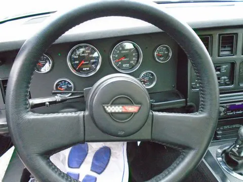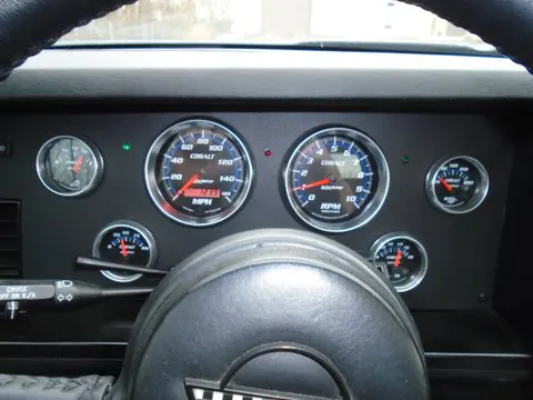 The LS3 from Street Performance came with it’s own ECU, so the old computer for the interior was ash canned–along with the video game dash–and Derek made his own wiring harness to feed updated, analog gauges.