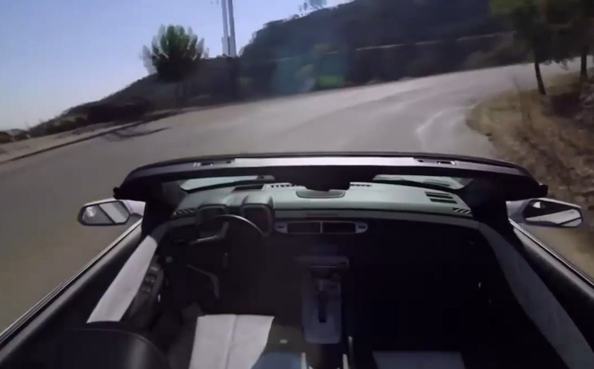 The video is something else, though… we go poolside with the aforementioned bikini-clad brunette at a home high in the hills above Los Angeles, while the (driverless) car lays rubber out of the garage and takes a tour of SoCal, blinking all the way.