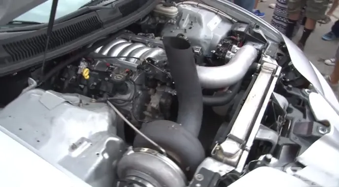 The Pontiac in this video, dubbed FR8Train, is definitely quick from point A to point B, with an iron block 408 fed pressurized air by an enormous single Forced Inductions Billet 94 V3/GT-55 1.40 A/R turbo under the hood. Well, mostly under – the outlet of the turbine section takes the shortest route possible for exhaust gasses to reach the outside world, straight through a hole in the hood.