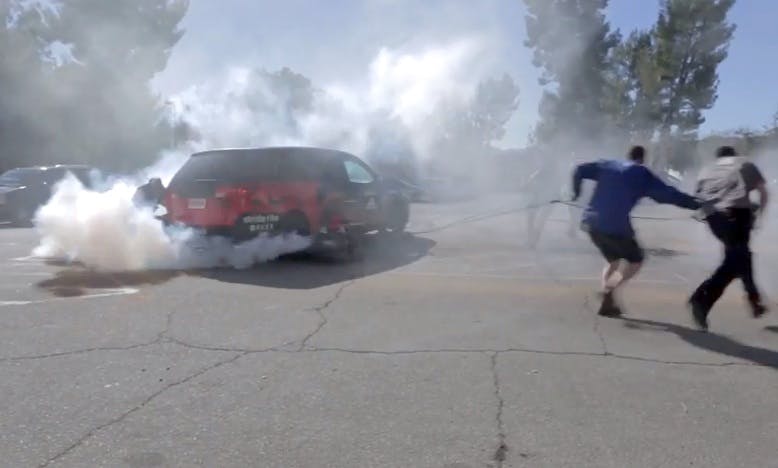 Some might call that cheating, but the video shows why it was a good idea – in the initial attempts to get the van to do a 90-degree slide in front of a Famous Footwear store, things went awry and the van had a close encounter with the curb. It’s probably good the kids didn’t get to experience that firsthand.