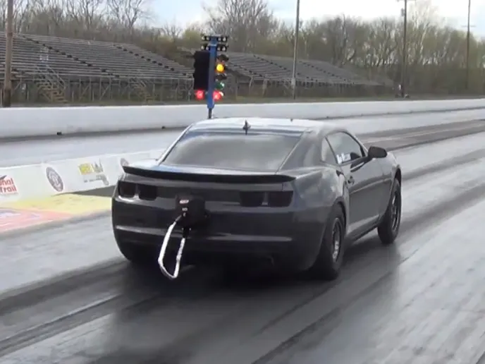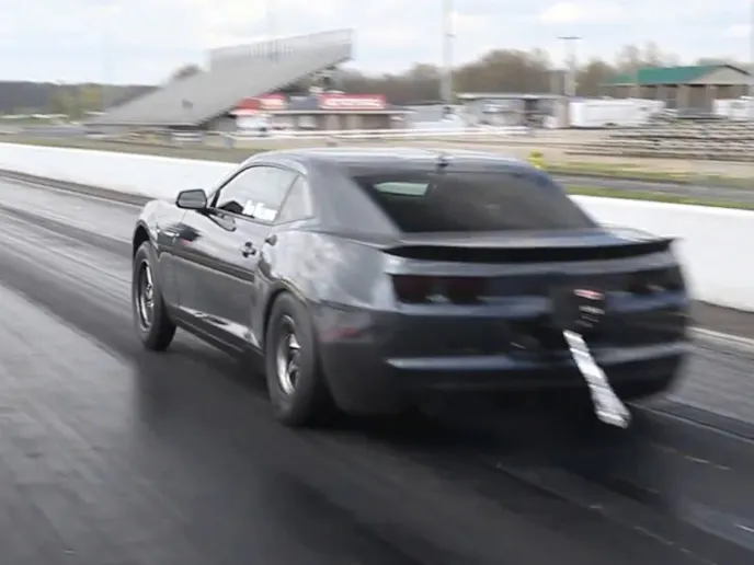 In a thread on Camaro5 we learned that the outing was originally slated to be just a test session at National Trail Raceway in Hebron, Ohio. In spite of the cold weather, driver Bob Williams quickly brought out the best in the gray 5th Gen, and a string of high-8 second passes made the record look more attainable.
