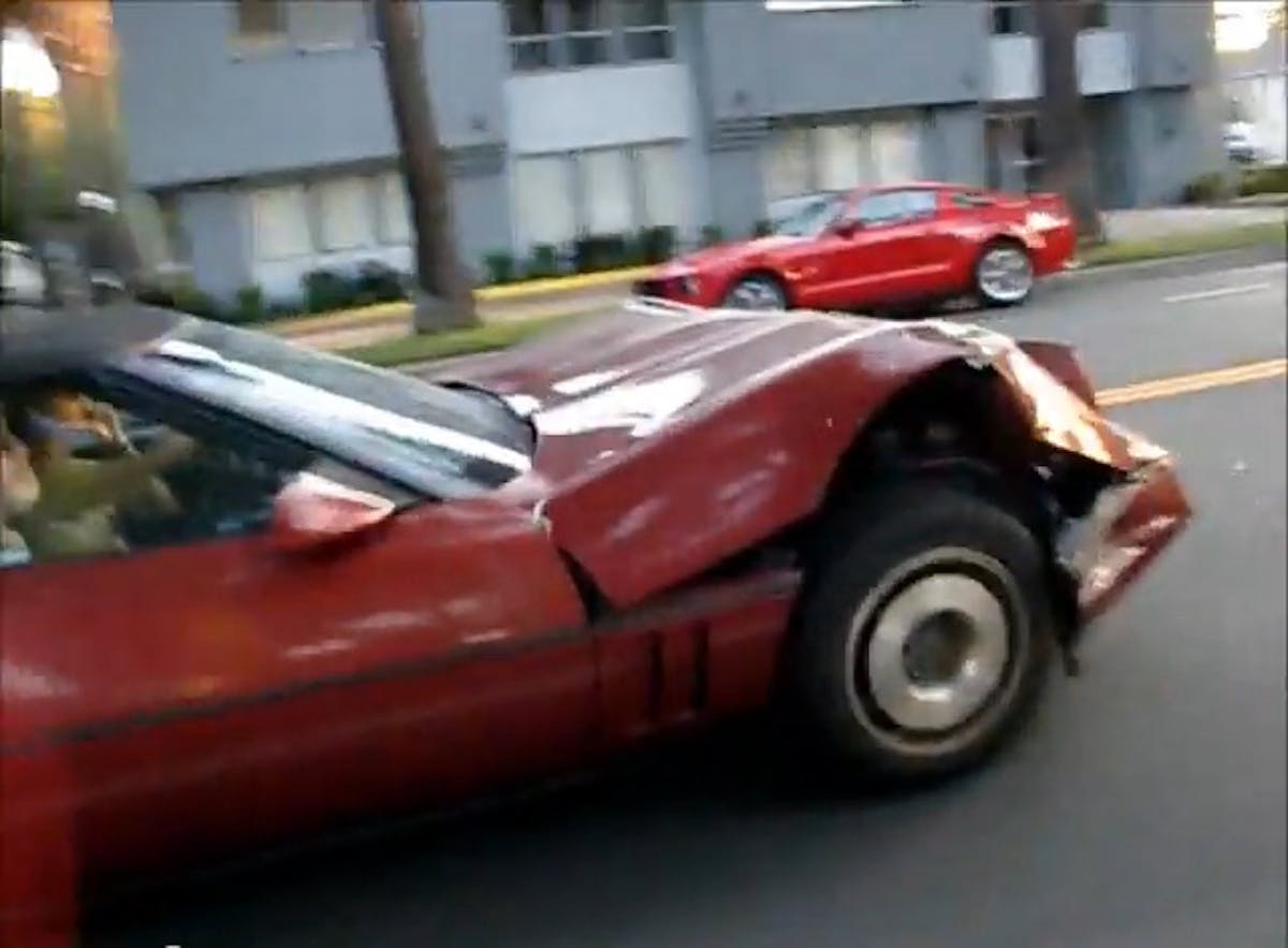 But that didn’t stop the owners of the Corvette in the video above from saving their American sports car, nor did it stop them from cruising it around Midtown Sacramento, California with the front end completely smashed in and the hood bent all out of whack.