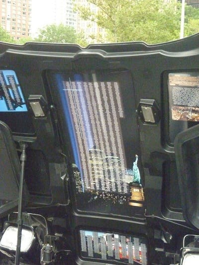 The Corvette is wrapped with patriotic images, including the American flag that spans both sides of the car, the picture of the flag raising in Iwo Jima and the complimentary picture of the flag raising at Ground Zero. Between the two flag raising images on the hood is an image depicting the Twin Towers at night prior to the terrorist attacks. Under the hood is the list of individuals who died in the September 11th tragedy.